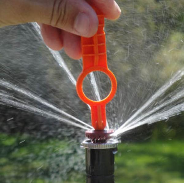 To make the upgrade, carefully pull the riser out of the sprinkler body, it’s spring loaded so keep a hold of it while you unscrew the old nozzle and replace it. After you replace the nozzle you may need to turn the system back on and rotate the body slightly to adjust the spray direction. Pull up the existing nozzles in your sprinklers. While holding them, remove the cap from the sprinkler and install the appropriate spray nozzle, as indicated on the plan. If you are using Hunter brand nozzles be sure to also buy this little orange tool to adjust the spray arc. Rainbird nozzles can be adjusted by turning the ridged rings with your fingers.