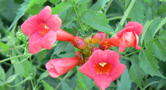 Trumpet Vine is a hummingbird’s delight with brilliantly colored, luscious nectar- rich flowers produced over a long season. From a human point of view the caveat is to provide a strong enough support and enough space for this vigorous rambler.