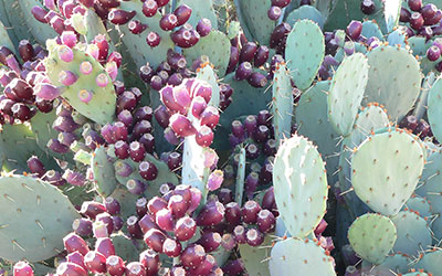 In high desert gardens, Engelmann Prickly Pear is one of the largest reliably cold-hardy cacti. Its dinner plate-sized pads stand perpendicular to the sun in summer, one of the ways it minimizes its water needs by avoiding the direct rays of the sun. Its flowers can be either yellow or a spectacular red-orange, and the same plant may have one color or the other in different years, but luscious red fruits always follow.