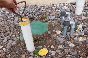 • Locate your shut-off valve (often hidden in a 3” PVC pipe; sometimes this pipe has a white or yellow cap on it as shown in the photo) and turn it to the right to shut it off