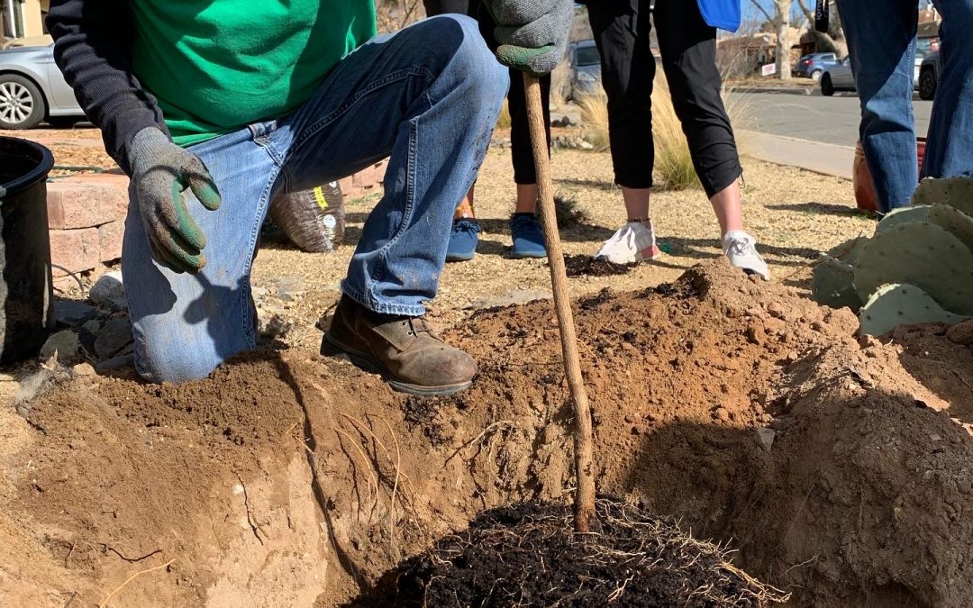 As for fertilizers, slow and steady wins this race. As Albuquerque City Forester Joran Viers said recently at a tree planting demo put on by Tree New Mexico and The Nature Conservancy, it helps to think of our trees (and other plants) as marathoners, not sprinters. When fertilizer is applied to trees, they can grow too fast for their own good and are more likely to develop structural problems and other issues. Fertilizers are not recommended at the time of planting perennial plants, either, because we want the plant’s energy to go into root establishment at a healthy rate to support the aboveground growth. The growth hormones necessary for healthy root development are found in the root tips and are made by the plant itself, so adding root stimulator to living roots is not necessary or even helpful. (Side note: Rooting hormone is potentially useful when you’re trying to get roots to grow quickly from cuttings where the roots have been removed completely.) So hold off on fertilizing for at least a few years while your plants are setting down roots.