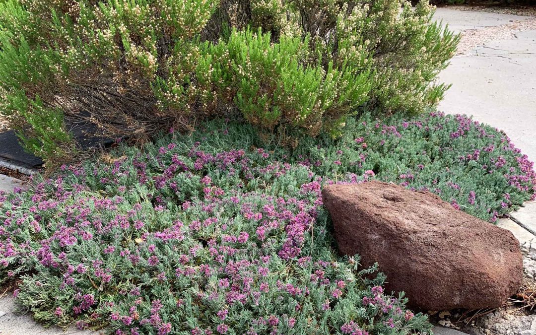 This drought-tolerant groundcover enjoys the heat from adjacent boulders and is wide spreading along walkways. The silver evergreen foliage is a welcome addition in winter. Lavender-purple flowers bloom from spring to summer, attracting pollinators.