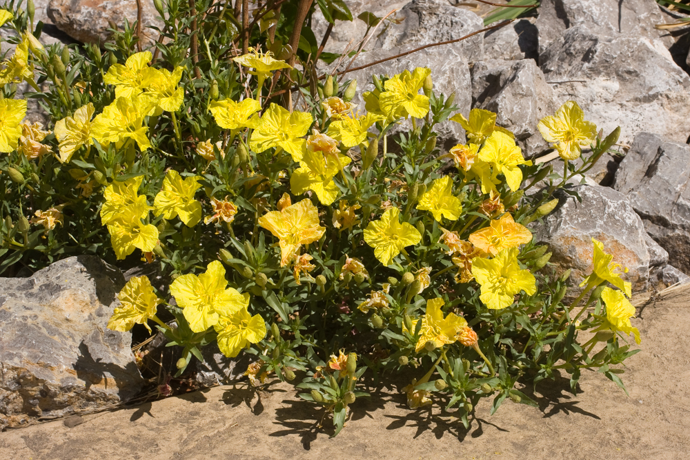 This spectacular native wildflower is everblooming with a profusion of large, bright yellow, four-petaled flowers. Its narrow gray-green foliage gives the plant a lacy look in the garden. Calylophus thrives in the heat and grows well in a wide range of soils, as long as they’re well drained. This tough plant is the star of any dryland rock garden or xeriscape. Giving it a good shearing before the growing season starts in late spring will keep it looking tidy and loaded with flowers.