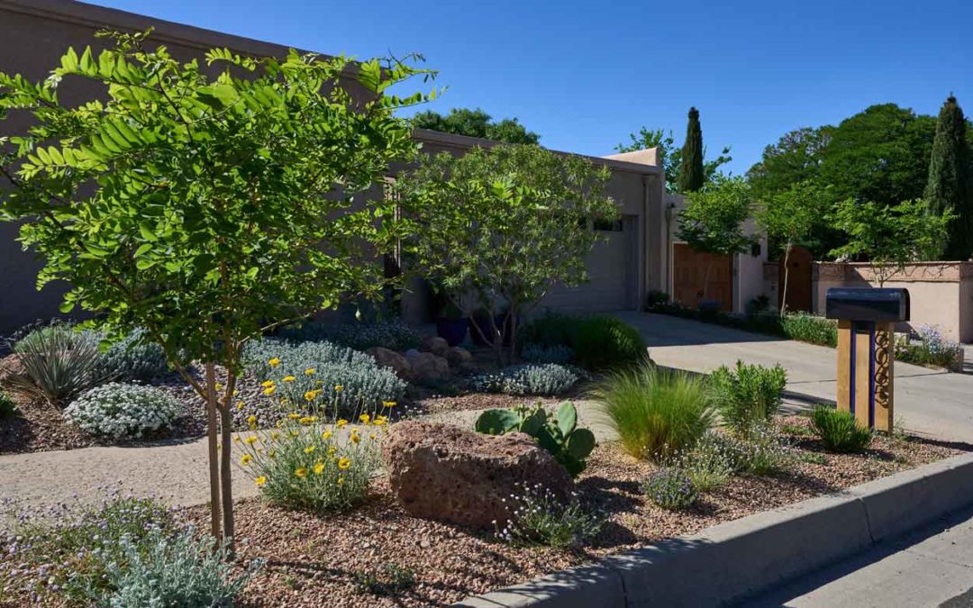 Geri Martinez’s property, which is located in one of the older areas of town surrounded by large established trees, had the kind of yard that’s typically found in Albuquerque’s UNM and Ridgecrest neighborhoods. It was covered in Bermuda grass and had a large mulberry tree. Geri was ready to refresh the front yard of her 60+ year-old home. With the help of a landscape designer, she came up with a planting design plan.