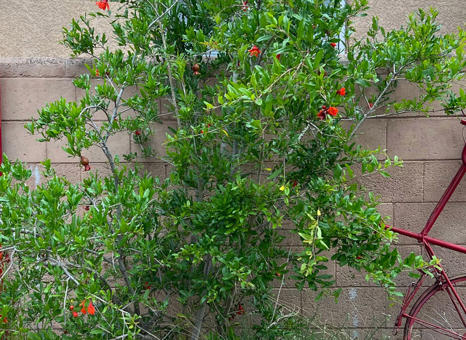 This fruit tree thrives against a hot wall with southern exposure. Beautiful orange flowers appear in the spring. After lots of pollination work by bees, pomegranates trees are covered with uniquely shaped fruit. This stunner needs only 4 feet of space because it has upright growth. During harvest time in the fall, it puts on a yellow foliage show then goes dormant for the winter. Pomegranate trees take about two growing seasons to fully set deep roots and produce fruit.