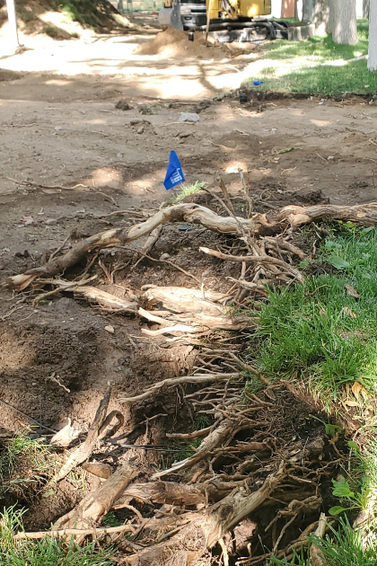 - Protect roots by covering the soil with 3 or 4 inches of arborists’ wood chips. This cools soil, reduces soil water loss, cools air above, breaks down and feeds minerals into the soil, and promotes growth of beneficial soil fungi. Avoid cutting roots when possible; when necessary, cut as few as possible and cut as far from the trunk as possible. Don’t compact soil by dumping gravel all over it or parking on it. Don’t apply herbicides to the root zone, which is larger than the canopy above.