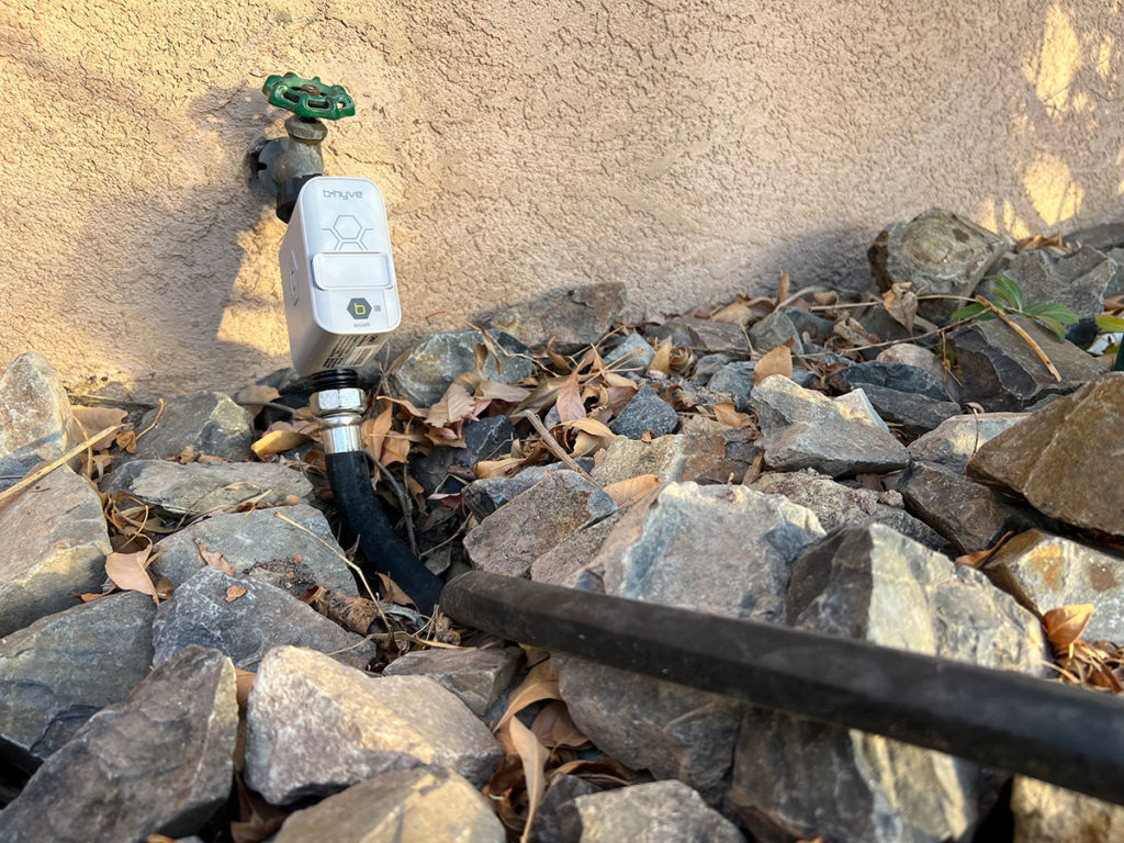 A timer that attaches to your hose is great for homeowners who aren’t ready to install an in-ground irrigation system and need an inexpensive (under $100) way to water. The hose timer attaches to your house near the spigot. You can then attach a simple polyline irrigation system to it or the tree watering system listed below. You could set up an above or below ground irrigation Polypipe with drip emitters to water all your plants. The irrigation dripline can stay in the ground year-round and be easily connected to an automatic in-ground irrigation system in the future.
