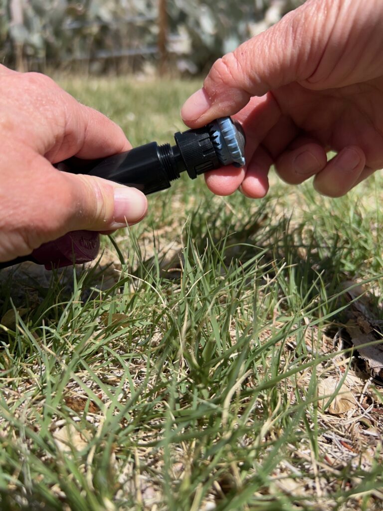 To make the upgrade, carefully pull the riser out of the sprinkler body, it’s spring loaded so keep a hold of it while you unscrew the old nozzle and replace it. After you replace the nozzle you may need to turn the system back on and rotate the body slightly to adjust the spray direction. Pull up the existing nozzles in your sprinklers. While holding them, remove the cap from the sprinkler and install the appropriate spray nozzle, as indicated on the plan. If you are using Hunter brand nozzles be sure to also buy this little orange tool to adjust the spray arc. Rainbird nozzles can be adjusted by turning the ridged rings with your fingers.