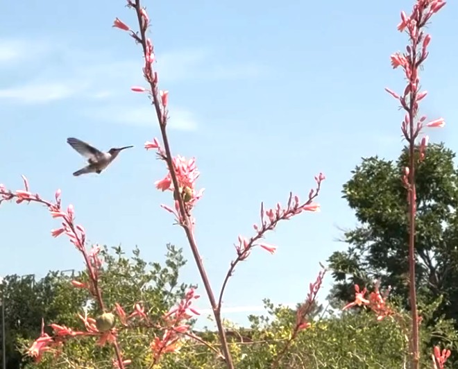 A hummingbird enjoying a red yucca plant.