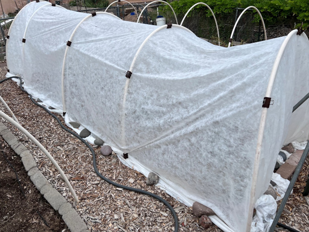 Another advantage of having hoops and shade or frost fabric is that it can protect plants from hail damage. Similarly, some people like to start their tomatoes under row covers to exclude leaf hoppers which can transfer the curly top tomato virus (Learn More in this article by NMSU.)