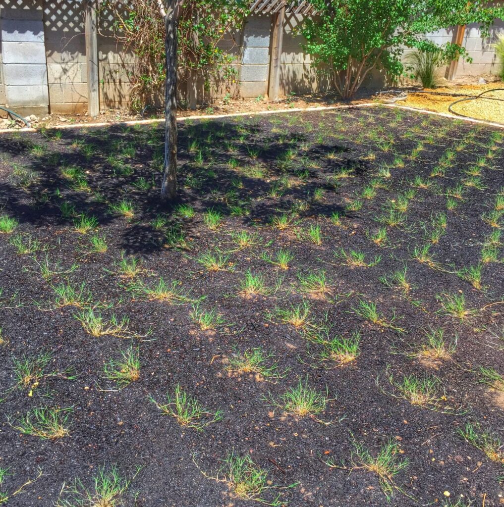 The grass itself “produces an extensive system of creeping rhizomes and stolons commonly called runner roots that often have a scaly appearance. It also produces fibrous roots at the stem nodes. Bermuda grass reproduces through seed and vegetatively through rhizomes and stolons,” according to NMSU, allowing it to spread with just a little bit of water, around 20” a year. I find that it rarely needs mowing because of the traffic we give it. I mow it about twice a summer to the highest setting my mower goes around 4”.