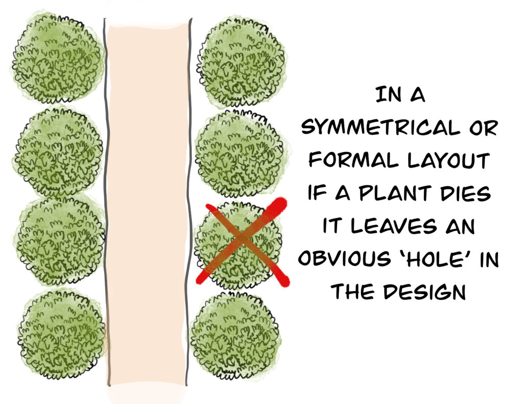 In an informal or “naturalistic” layout, a missing plant is not an issue because there’s not an expectation for that space to be filled. It also allows flexibility in the design — shade-loving plants near the tree, plants that can handle more water under the downspout. If a particular plant isn’t doing well, you can transplant it to another location. Using an informal or naturalistic planting design allows you to add to your garden over time as it matures and changes for years to come.