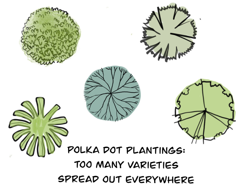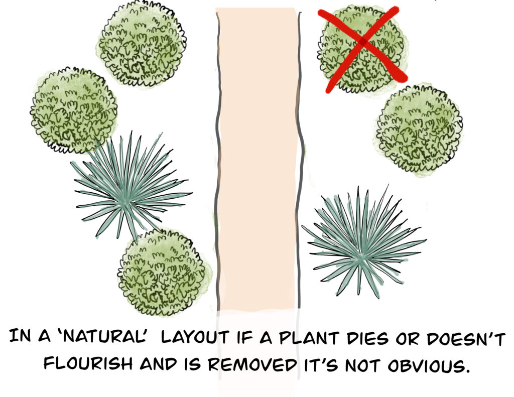 Another mistake DIYers sometimes make when designing landscapes is opting for a symmetrical layout for the new plants. For instance, they will have corresponding rows of evergreen shrubs on either side of a path as shown below. There are a couple of reasons why this is less than ideal. One is that an unhealthy plant (or worse, one that is dead) is immediately noticeable. Also, in a formal layout, you’re anticipating that the plants will grow to a uniform size and shape. However, this is not the case with native and xeric-adapted plants (and most plants, really). Once in the ground, they’ll be responding to all sorts of different conditions. Too much shade from a nearby tree limits a plant’s mature size, or extra water from the roof causes one to get larger than the others, for example. And if you did need to replace one plant in a formal layout, it could take a while for the new one to catch up to the others (assuming you able to find the same variety as the originals).