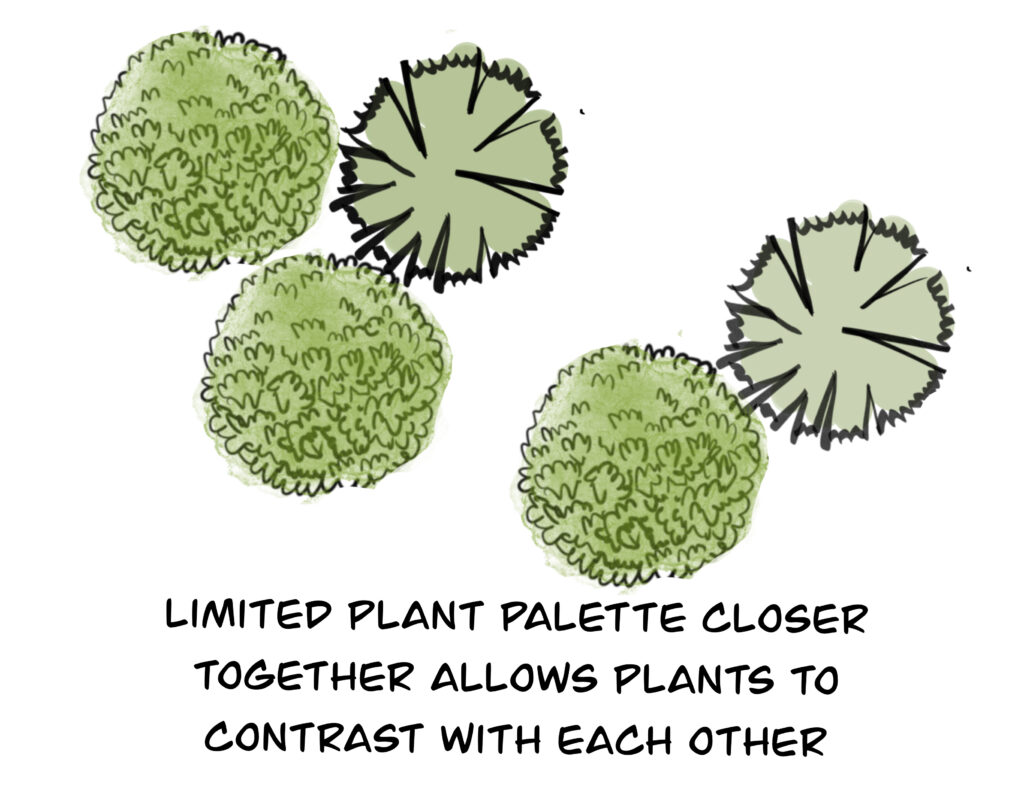 In these instances, you can pair plants that have widely different leaf shapes, like the agave and ephedra pictured below. The effect is something you wouldn’t appreciate if there was a large gap between the plants. A lot of flora have distinctive attributes like bark patterns, seedheads, dried flowers or an overall shape that allow them to stand out when accompanied by contrasting plants.